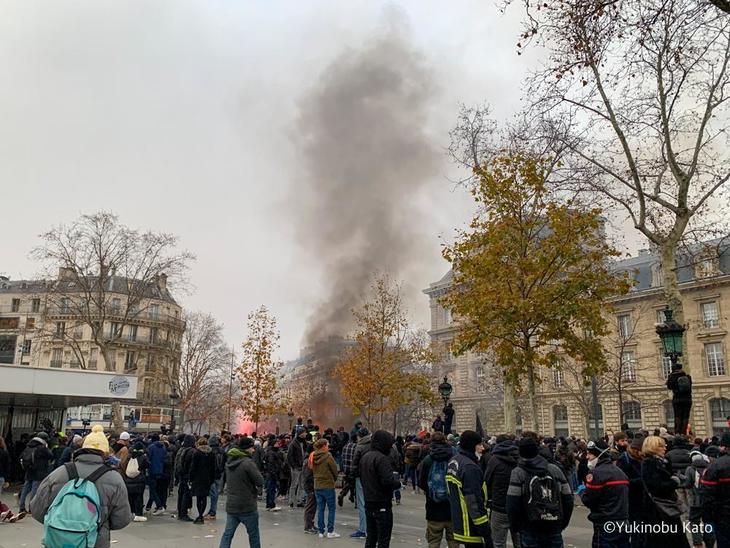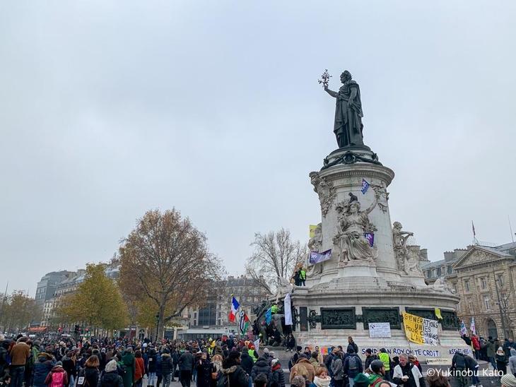 ▲12月5日午後パリ市内共和国広場に集まったデモ参加者たち