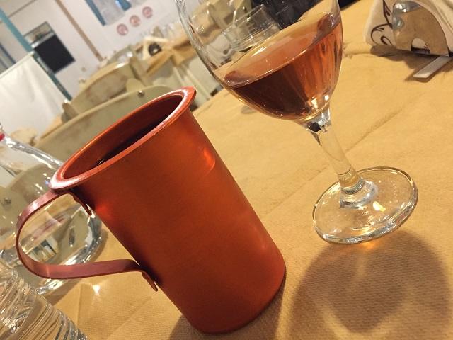 地元産のロゼワインを頼んだところ、金属製のカラフに入れられたのが出てきました。このタイプの金属容器は昔、ギリシャでの量り売りに使用されていた計量カップが原型なんだそうですよ。日本の一升マスみたいな物なんでしょうね! 同行者2人は同じく地元産の赤ワインと白ワインを頼んだので、それぞれ別の金属カラフ入り。