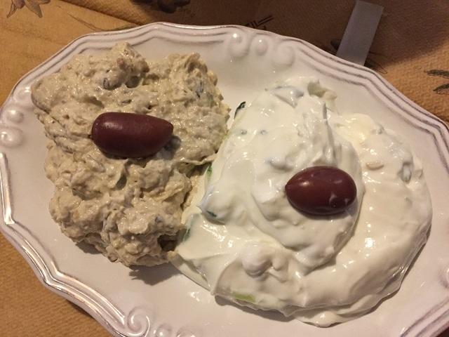 前菜は何品か頼んで3人でシェアーしました。まずはパンと一緒に食べるよう、ツァツィキ(ガーリックやキュウリ入りのヨーグルト)と茄子のペースト。特に後者は優しい味でおいしーい!