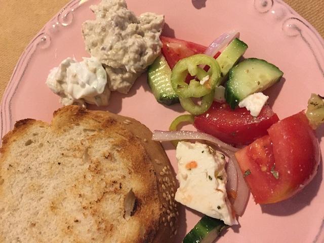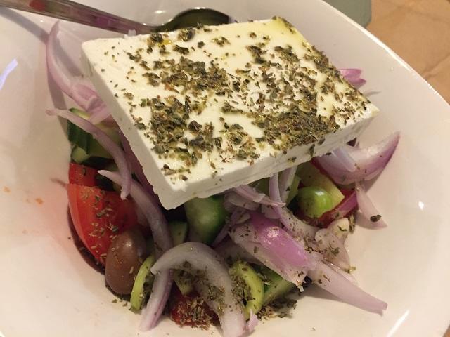 ギリシャ定番のサラダといえば、こちら。トマトやキュウリ、赤玉ねぎ、塩漬けオリーヴ、フェッタチーズにオレガノ、酢、オリーヴオイルを回しかけたもの。ここのはフェッタが丸ごと乗っかってたので、それをざっくり崩しながら食べました。