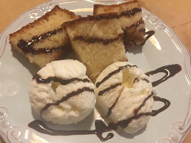 お勘定書きとともに、お店からのサービスでデザートが! たった今もうお腹一杯と口々に言っていた3人ですが、スポンジケーキとバニラアイスなんて出されちゃったら別腹ですよね♪