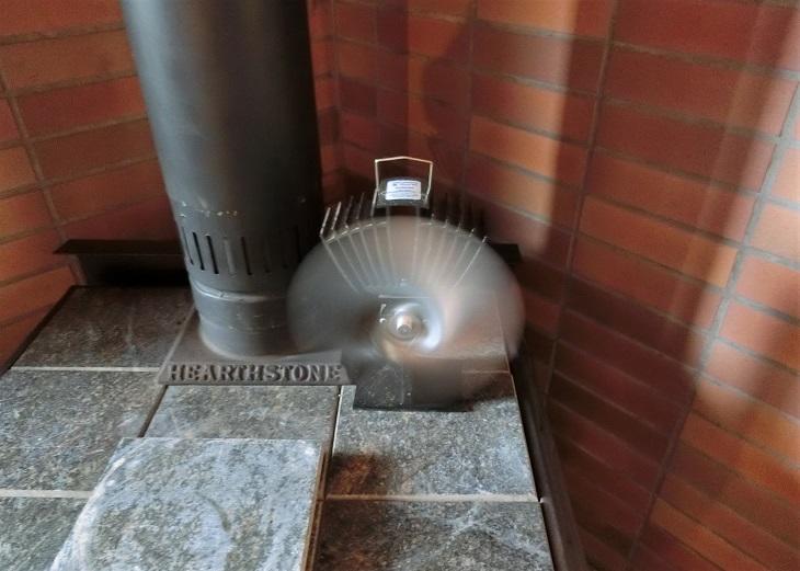 ストーブの上でくるくる回っているのは、温風器です。ストーブの熱を感知して回るタイプでエコなんですよ。