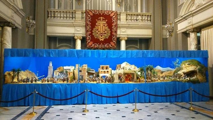 なお、今年も市庁舎内ガラスの間に飾られたベレンが一般公開されます。ベレンとはスペイン語でベツレヘムの意味で、キリストの生誕シーンやベツレヘムの町の様子を人形で再現したものです。生誕以外にも聖書のシーンが登場することもあります。ベレンやナシミエント(生誕シーンのみの人形)はスペインの伝統的なクリスマスデコレーションです。この市庁舎のベレンは総面積45㎡で、300体もの人形を使っているとのこと。