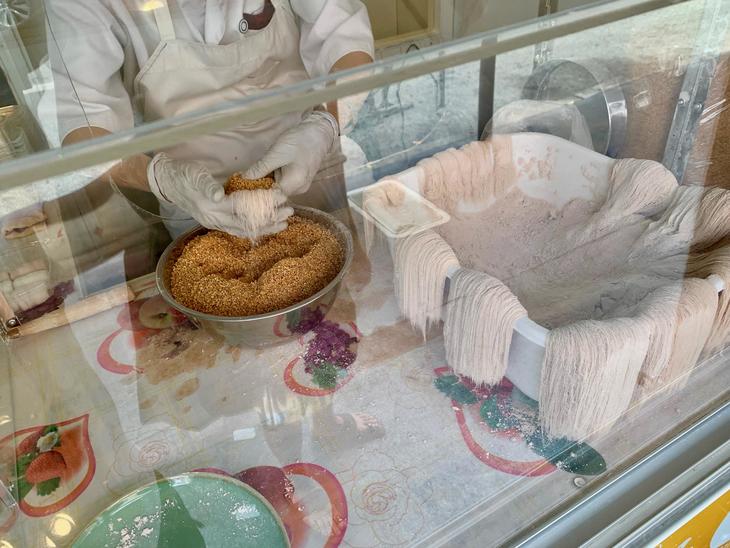 作り方を観察してみると、塊(水飴)を少しずつ引き伸ばし、粉をまぶしながら8の字のようにクルクル回しながら細〜〜〜く伸ばしていくと絹糸みたいなのができる。糸巻きの歌を歌いたくなる。 ある程度塊になったら切り取る。