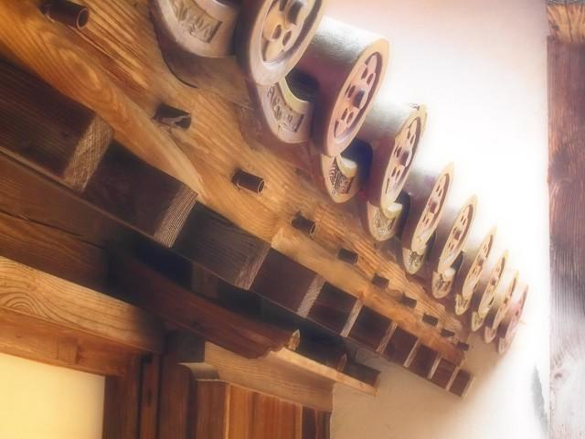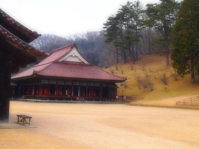 講堂の入母屋造りの屋根については、先日少しご紹介しましたが、作りも手が込んでいて、こけら葺きの屋根を作った上に垂木ごと漆をかけた一枚板を張り、その上に備前焼の瓦をのせているとボランティアガイドさんから説明を受けました。