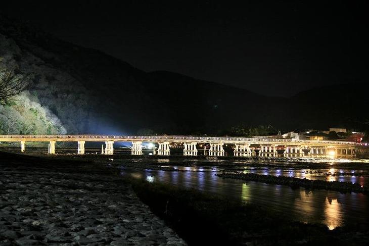 幻想的な薄紫の光に、山々と渡月橋が浮かび上がっています。