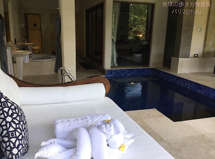続いて、寝室。他のビラに比べて小さめですが、充分寛げる様に工夫された配置です。書斎スペースからはプールがすぐ目の前で、その先には、ギラギラと強い太陽光が注いでいるジャングルと真っ青な空を眺めることができます。此処に座って手紙の一通でも、家族や友人に書きたくなる気分にさせてくれますね。