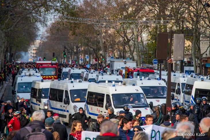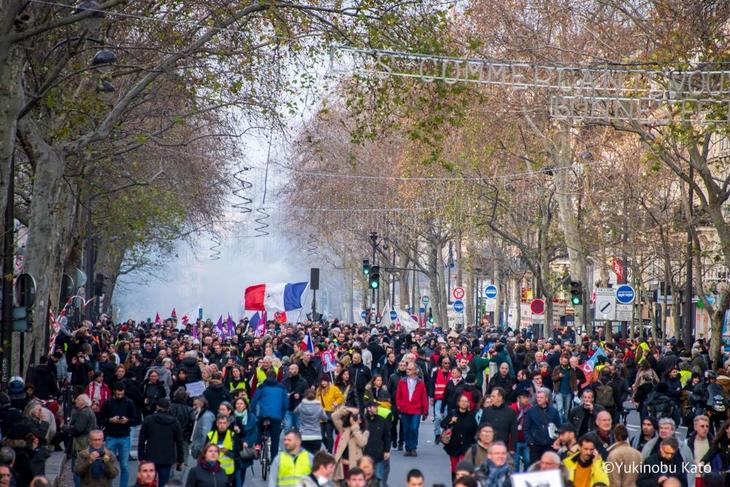 ▲12月17日に開かれた年金改革抗議デモでボーマルシェ大通りを行進する人々