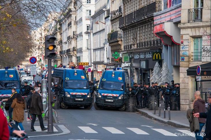 ▲12月17日デモの通り道であるバスチーユ広場を警備する憲兵隊