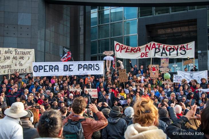 ▲12月17日デモに参加しオペラ・バスチーユ前で歌うパリ国立オペラ従業員ら