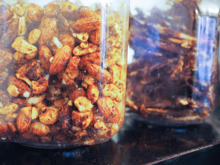 カウンターに並んでいたボトルのひとつに入っている「スパイシーナッツ」(380円)。こちらも自家製だそう。