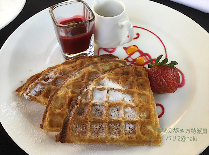 注文したのは、マンゴートライフルやフルーツミックスジュース(パイナップル、レモン、アップル、ジンジャー)、野菜ミックスジュース(ビーツ、キャロット、セロリ、ジンジャー)、カプチーノ、トッピングがサーモンのスクランブルエッグ、ココナッツとバニラビーンズのライスプディング、そしてベルギアン(ベルギー)ワッフルにメープルシロップ、ベリーソースを選びました。