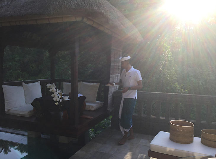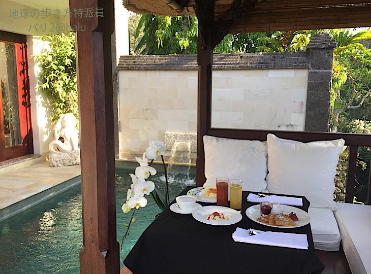 ビラでの食後の食器やグラス等の片付けは、ゲストが部屋から出た時を見計らってスタッフが下げてくれます。朝食もおいしいので、思いのほかたくさん食べてしまった方は、食後にプールに入って食べた分を消費してみるのも良いかもしれません(笑)。