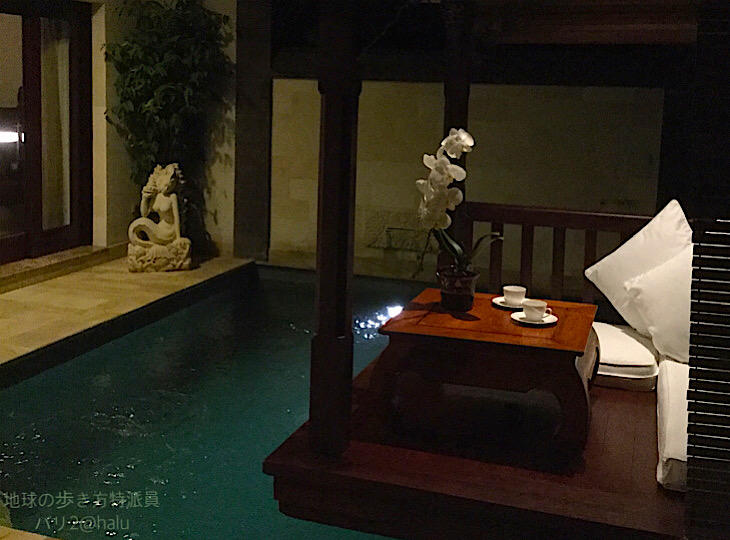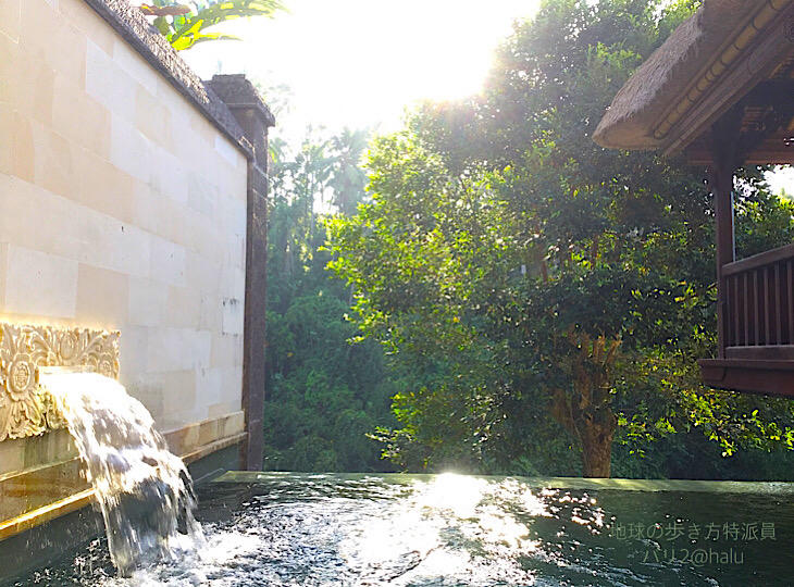 プールも朝から楽しめますよ。ウブドは南に比べて平均気温が低めです。でもこちらのプールは外気温に応じて適温に保たれているので、水温が温水プールのようでとっても気持ちがいいです。