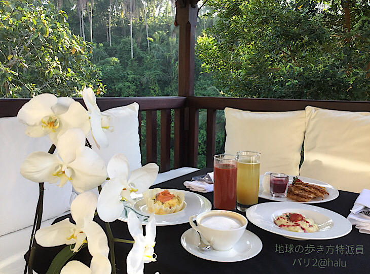 朝日を浴びながら、ジャングルの樹々の香りを吸い込み、鳥の囀りを聞きながらの贅沢な朝食です。