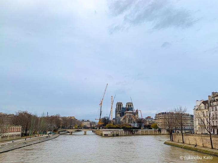 ▲セーヌ川と修復工事が進むノートルダム大聖堂