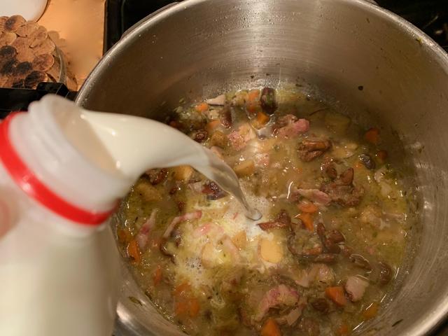 いよいよミルクを投入。 そして殻をとったアサリも入れ温める感じ。