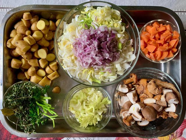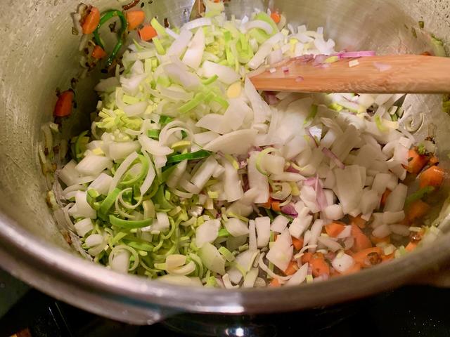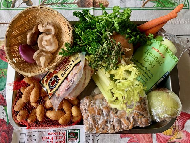 アサリ以外に玉ねぎ・人参・じゃがいも・ベーコン・牛乳 冷蔵庫にあるカレーの材料で賄えそうだ。 玉ねぎはちょっとしかなかったのでトレーダージョーズでリーク(Leek)を買い足し、キノコも入れるといいあって残りの椎茸と冷凍アンズ茸、冷蔵の端っこにあったエシャレット一片、タイム・ローリエ