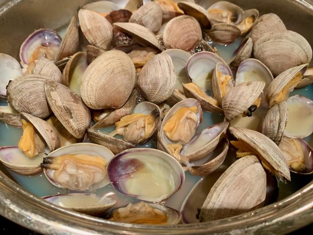 アサリは、砂抜きしてから水から上げて殻をきれいに洗って "ワイン(酒)蒸し" にするとプロっぽいこれで風味アップ間違いない。 蒸した時に出た汁は後でチャウダーの鍋に入れるので取っておく。 アサリが冷めたら量の2/3くらいを殻から外して殻付きは仕上げ用に別にしておこう。