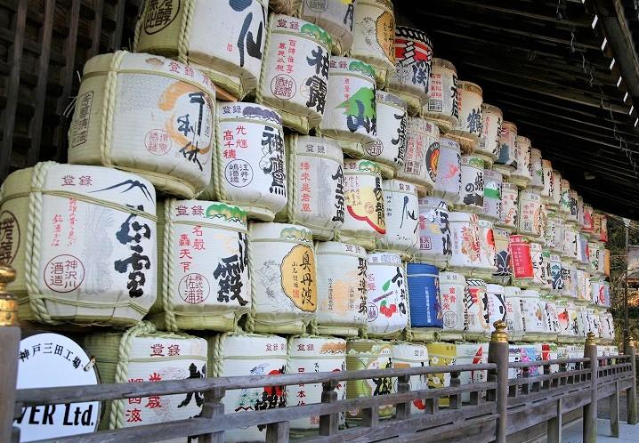 社殿前に積まれた酒樽は、各地の酒造業者が奉納されたものです。