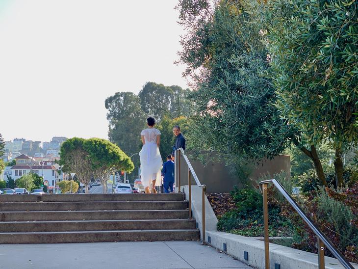 撮影を終えたウエディングドレスの女性の後ろ姿はかなりお疲れ気味だ。