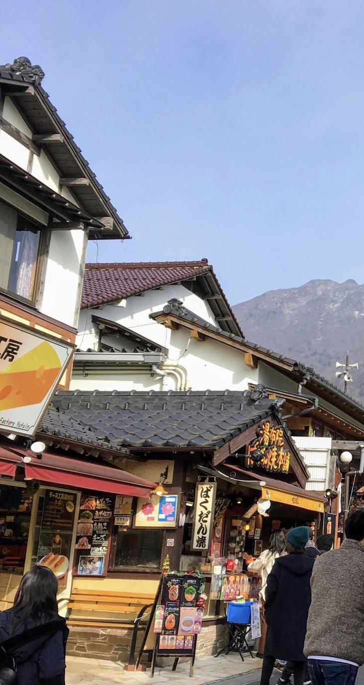 この時点で既に数件の土産物屋さんが見られますが、小さな橋を渡るとまたすぐに「湯の坪街道」があり、通りはより長く伸び、商店も増えるのでブラブラ歩きにぴったりです。地元の人や他県の九州の人がいうには、10数年前までは湯布院と言えど、平日までこれほどにぎわうことはなく、外国人もここまで多くはなかったそうです。今では商店、飲食店、どこを見てもメニューや表示が英語は当然として、中国語に韓国、ベトナム語まで併記されるのが普通になっています。中国人観光客なんかにはまだまだ店頭デモ販売が人気で、ひと口柚子ゼリーの出店で皆さんたくさん試食しており、にぎわっていました。