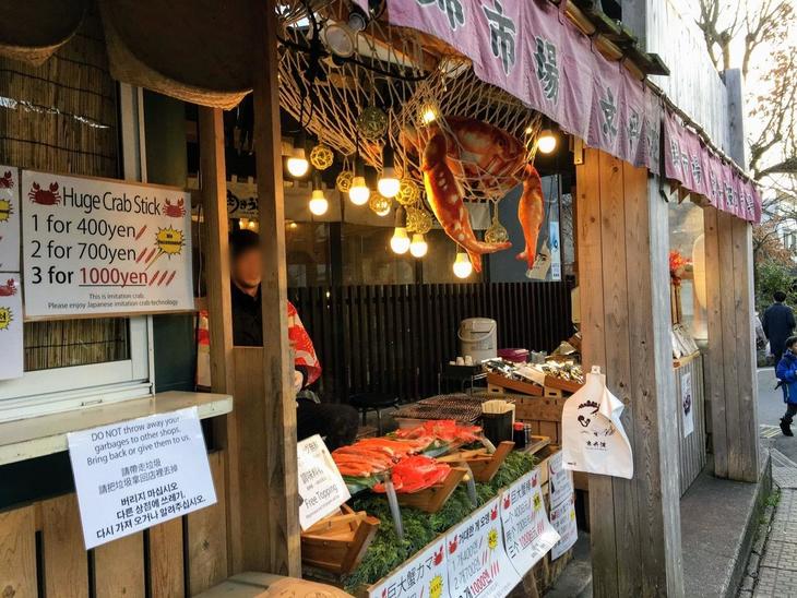 私はあまり大分県とカニの結び付きにピンと来ませんが、なかでも人気があったのがカニの爪の部分が抜き取られて売られてるカニ・スティックのお店。料金表などの紙にはむしろもう、日本語の表記を見つけることの方が困難です。外国人たちがワッと来て、次々に買っていきます。どこのお店でも、売り子さん達はしっかり片言の外国語で接客しているのに感心しました。