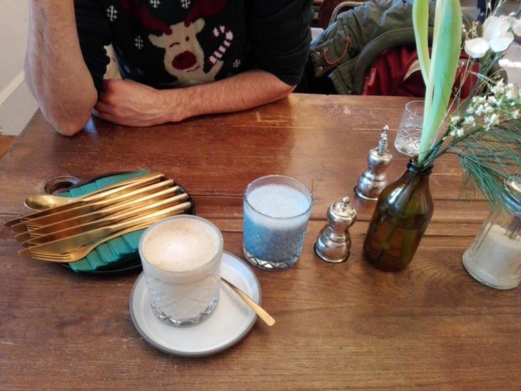 興味をそそられるユニークなメニューの中から、スパイスの効いたカルダモンラテとバナナ、リンゴ、スピルリナのスムージーを注文。