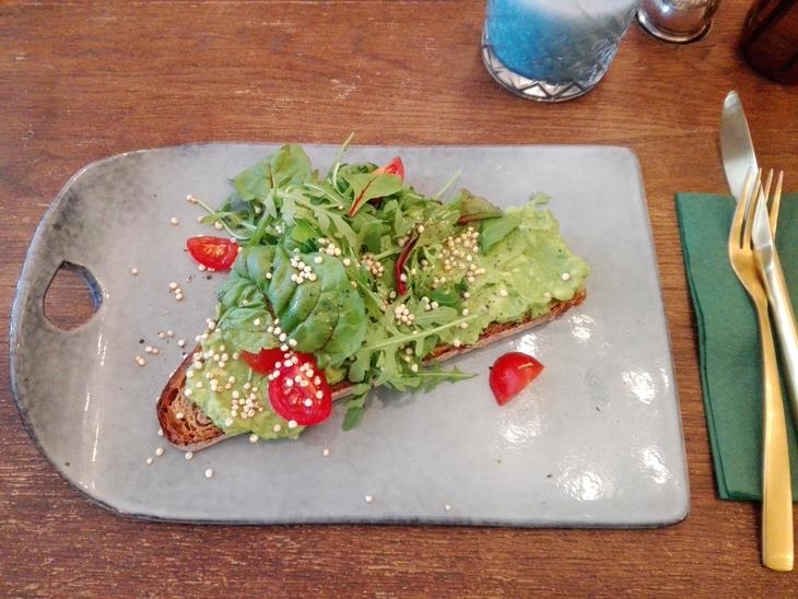 こちらは、「i love avo」という名の、アボカドクリームとルッコラ、ポップアマランサスがのったオープンサンド。パンはÖfferlの天然酵母を使用したオーガニックのもの。
