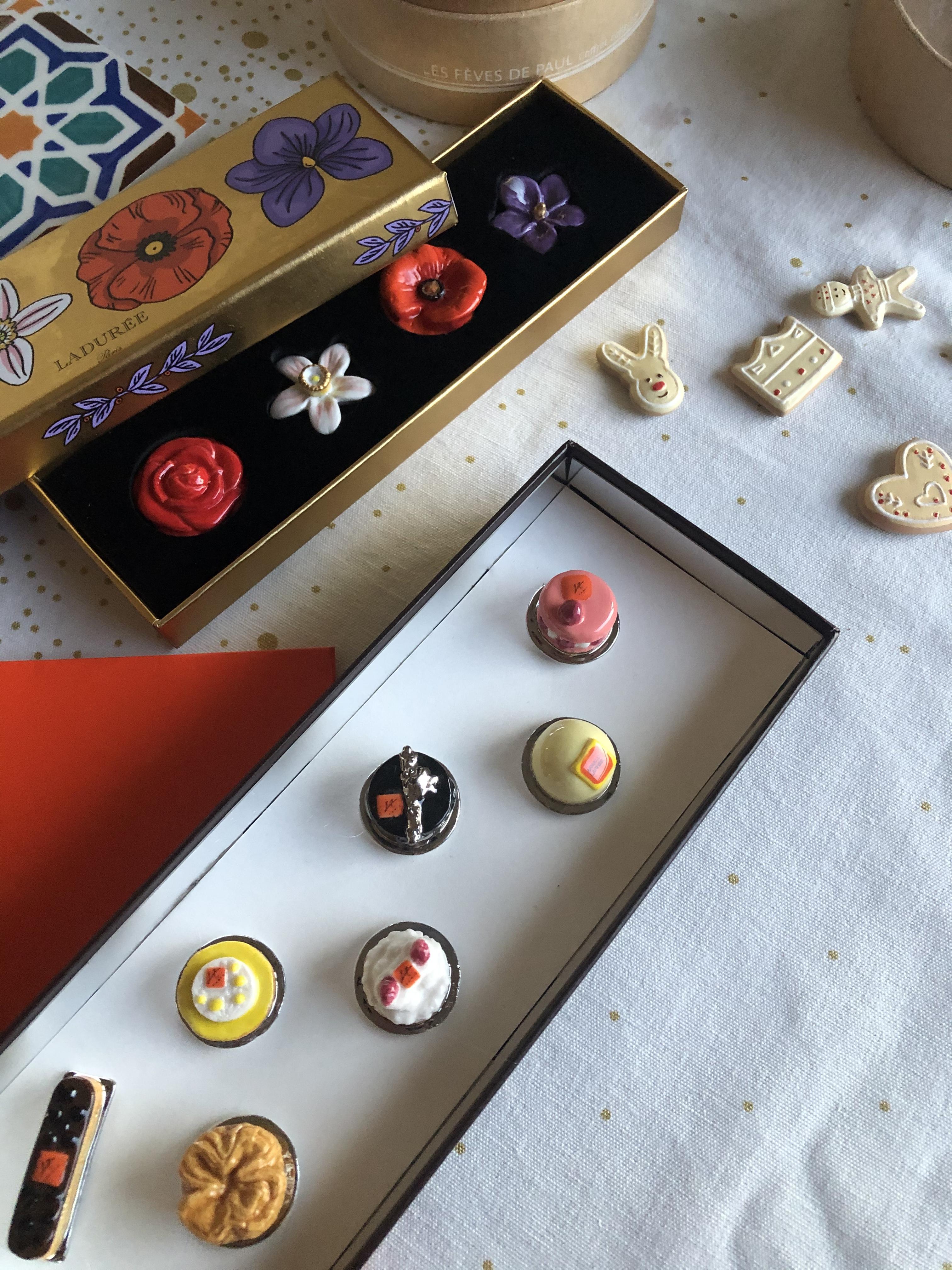 ピエールエルメなど、有名店は金属や陶器の有名ブランドとコラボした凝ったフェーブが付いています。