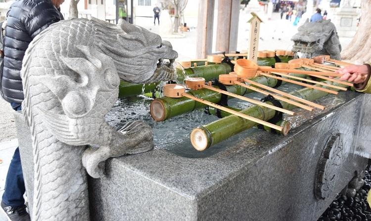 手水舎では、ひしゃくで水をすくって左右の手にかけた後、手の平に水を注ぎ、口をすすいで清めます。