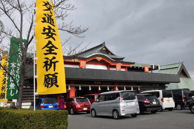 右手にある祈祷殿では車の交通安全の祈祷が行われています。車の祈祷では有名なところです。