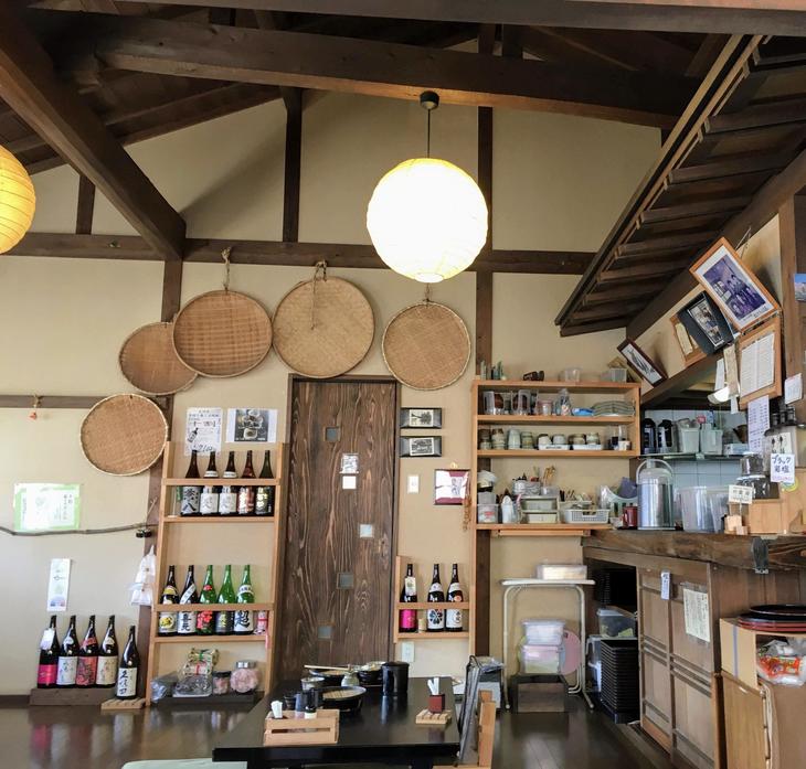 内装は昔ながらのようでいて、高い天井や茶色い木の梁や壁にかけられた大きな竹の網みザル、まるでインテリアのように整然と並べられた日本酒の瓶がやけにオシャレで、逆にモダンな古民家風カフェのようでもあります。