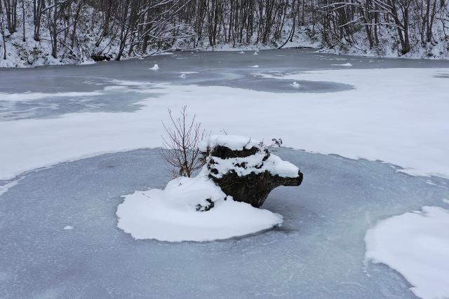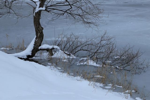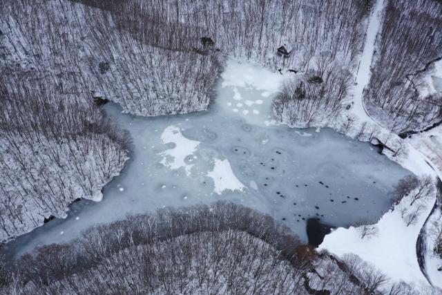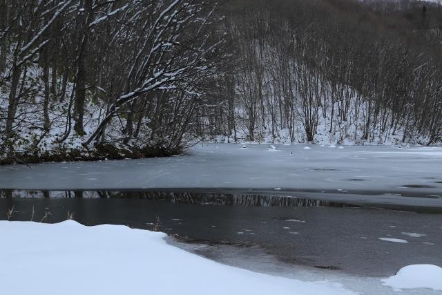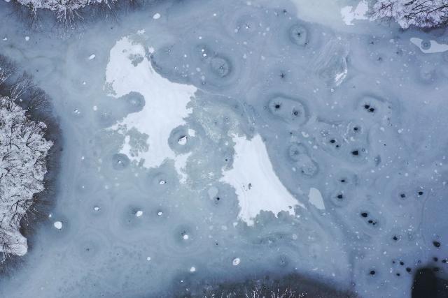 結氷進む湖面は、幾何学模様の如き不思議な表情を魅せています。