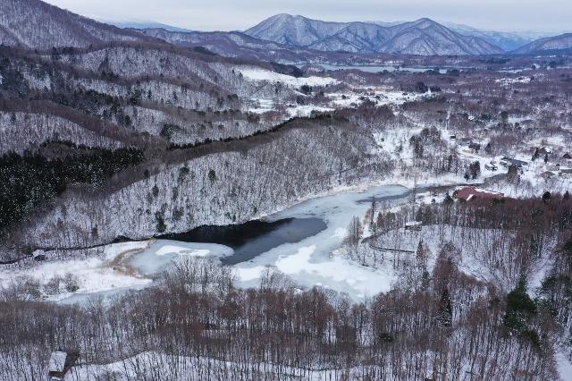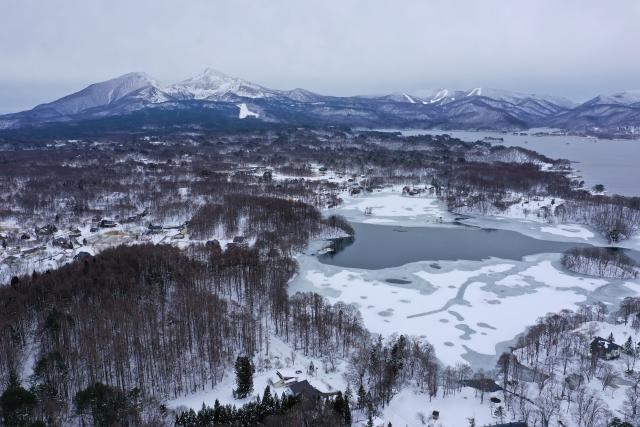 曲沢沼上空から望む磐梯山&猫魔ヶ岳方向です。(右手前側に曽原湖、奥に桧原湖)