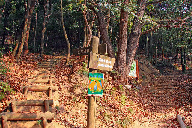 登り口はいくつもありますが、車の停めやすい護国神社の登り口を利用します。遊歩道になっているので、看板も多く歩きやすい登山道です。まず、三勲神社跡を目指して歩きます。