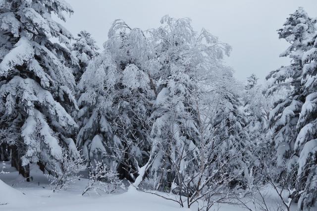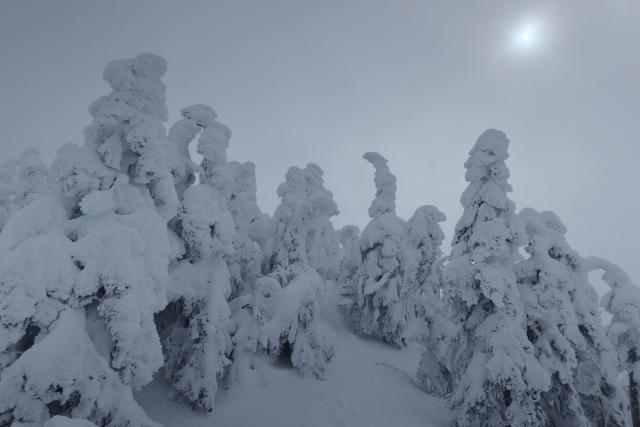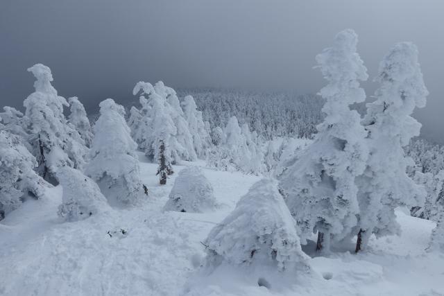 厳冬期、付近一帯に広がるオオシラビソの原生林は国内最大級の樹氷原と化します。