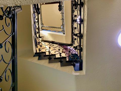 礼拝場は二階になるが、階段を見上げると更に上の階へ続くまるでレースのような螺旋の手すりがとても美しい階段。