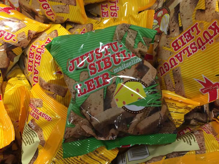 もうひとつはビールのお供にぴったりのもの。商品名を直訳すると「チーズ玉ねぎ黒パン」という名前なのですが、味のイメージは、おいしいバターガーリックトーストです。およそ50〜70円くらいです。ちなみに黒パンはエストニアの国民食です(黒パンだけを食べるなら、MUHU-LEIBがおいしいです)。