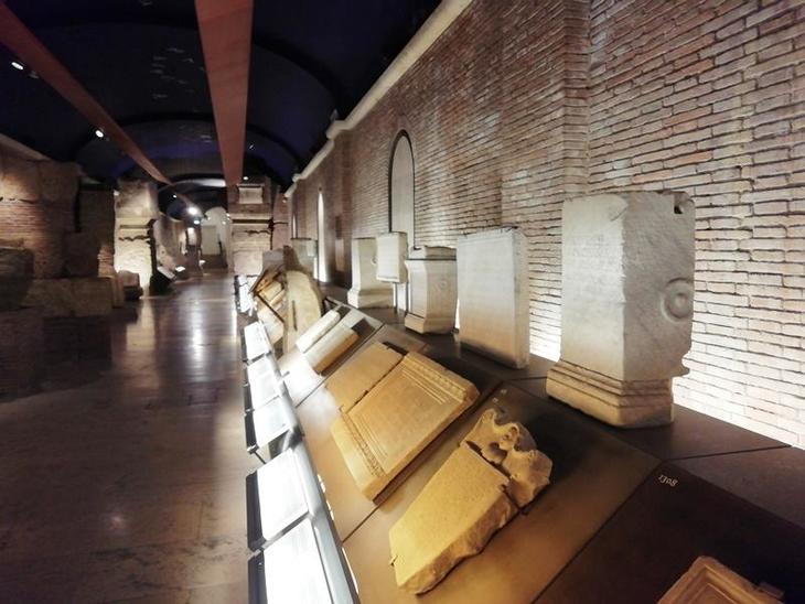 カピトリーニ美術館を構成するコンセルヴァートリ宮とヌオーヴォ宮は、地下のトンネルで繋がれていますが、その途中では現在の市庁舎のセナトリオ宮の地下にある古代ローマの公文書館(タブラリウム/伊語:Tabularium)を見ることができます。この法律や公的記録が保管されていた施設は、青銅版(タブラエ)が保管されていたことによりその由来があるとされています。