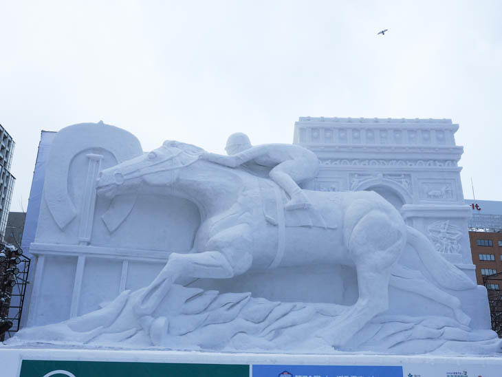 大雪像「世界を目指して駆けるサラブレッド」。