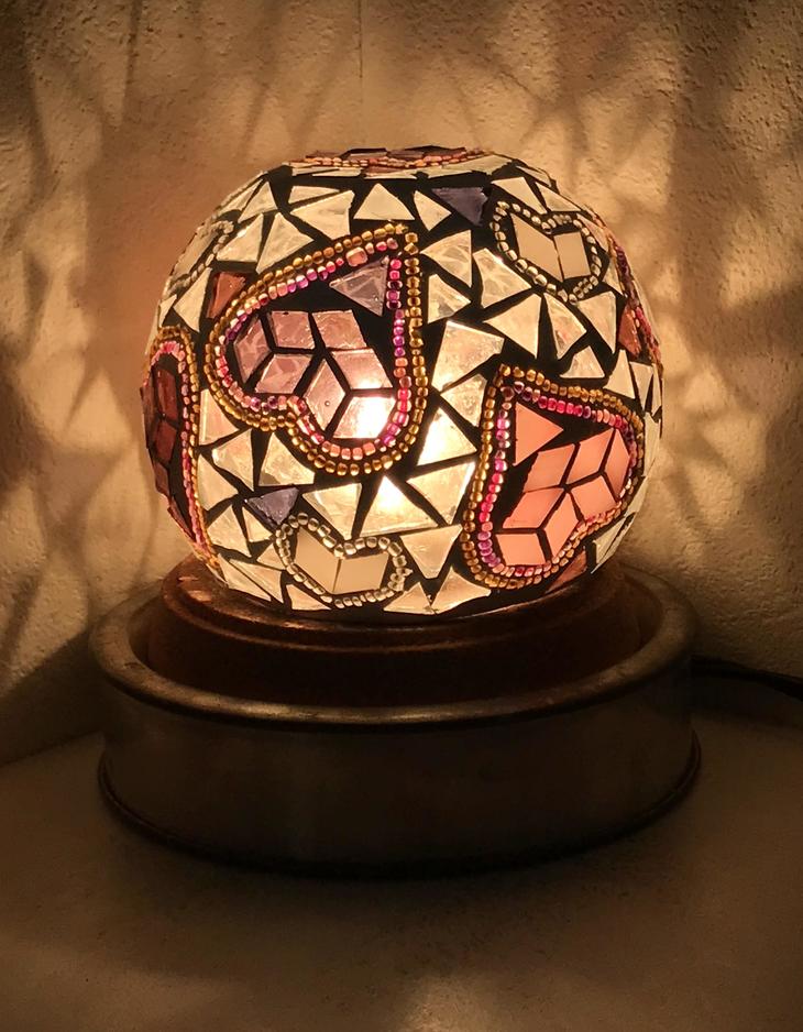 あかりを灯すと、モザイク模様を通して宝石のような色とりどりの光が現れます。