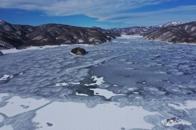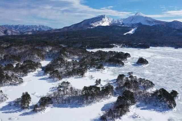 ここ数日の冷え込みで結氷が進んだ桧原湖
