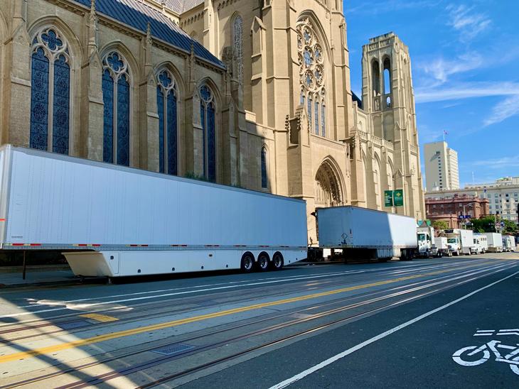 ノブヒルにある『グレース大聖堂』カリフォルニア通り沿いに大きな白いトラックが並んでいました。