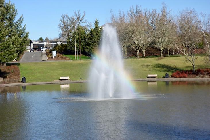 大きな道路からそれほど離れていませんが、噴水の上がる湖もあり、とてもいい雰囲気です。夏場は、湖に面したパチオ席も利用できます。