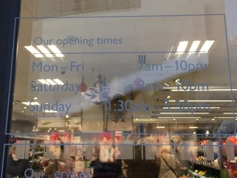 こちらの営業時間は、月~土曜日/午前7時から午後10時、日曜日/午前11時から午後5時です。日曜日は開店時間が遅く閉店時間がかなり早いので、お間違いのないように。