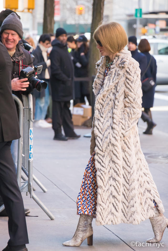 ニューヨーク・ファッション・ウィークのショー会場に入れるのは、業界関係者やプレス、フォトグラファーに限られます。つまり、私たちが会場内に入ることはできません(大金を払えば、話は別)。でも、会場外なら誰でもウロウロできますよ(笑)。有名人がゲストとして来ていることも多いので、遭遇するチャンスも。2020年秋冬コレクションでは、ケイティ・ホームズやアレック・ボールドウィンなどの俳優やアーティスト、リアンドラ・メディーンなどの有名ブロガーのほか、映画『プラダの悪魔』のモデルになった、アメリカ『VOGUE』の編集長アナ・ウィンターも来場。