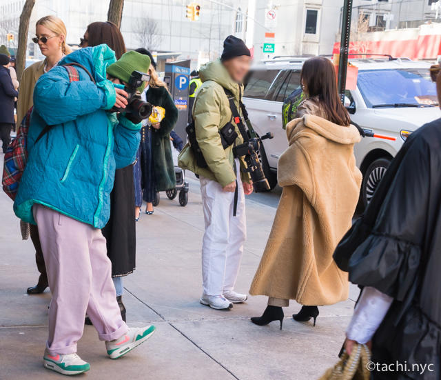 ニューヨーク・ファッション・ウィークの会場内はパツパツに混んでおり、来場者のiPhone(携帯電話)画面の隙間からしかショーは見られません(苦笑)。長く待たされた挙句、ショーは15〜20分ほどであっけなく終わります。実際におもしろいのは会場外のストリートで、有名人やモデルを待つフォトグラファーと写真を撮ってもらいたいファッションマニア、遠巻きに眺める野次馬でごった返します。『VOGUE』や『WWD』などの各有名ファッション誌や「ゲッティ(Getty)」のストリートスナップ専門フォトグラファーがモデルや有名人の写真を撮ろうと待ち構えているので、あなたもメディアに載る可能性があります。たとえそれが偶然に写った、写真の隅っこであったとしても(笑)。