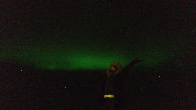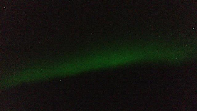 三脚をセットし、アプリを使って、iPhoneで撮影してみると緑色のオーロラが写し出されました。