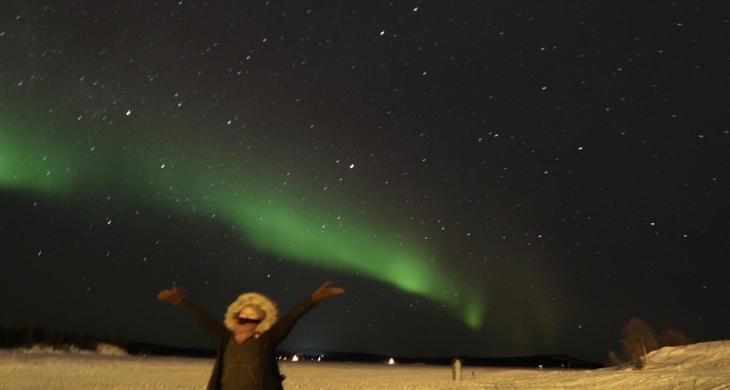 ■イナリ湖の上でオーロラ鑑賞 今回、利用したホテル・イナリはイナリ湖畔に建っていて、オーロラ鑑賞につきものの面倒な移動や長い待機時間は必要なく、この凍った湖の上に立つだけで気軽に楽しめます。